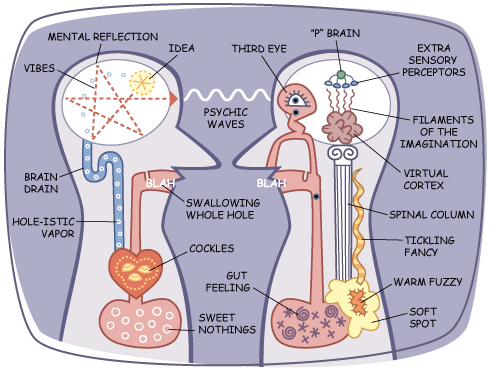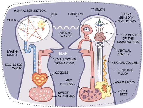 The psychic picks up the psychic waves through the third eye located in the sinus cavity. The idea sinks in, meaning it sinks to the abdomen creating the gut feeling associated with premonition. The gut feeling activates the soft spot creating a warm fuzzy which tickles the fancy sending a tingle up the spinal column. Atop the spinal column the virtual cortex vibrates the filaments of the imagination which stimulate the extra sensory perceptors attached to the psychic brain, known as the P brain, where the psychic “reads” the subject’s thoughts.